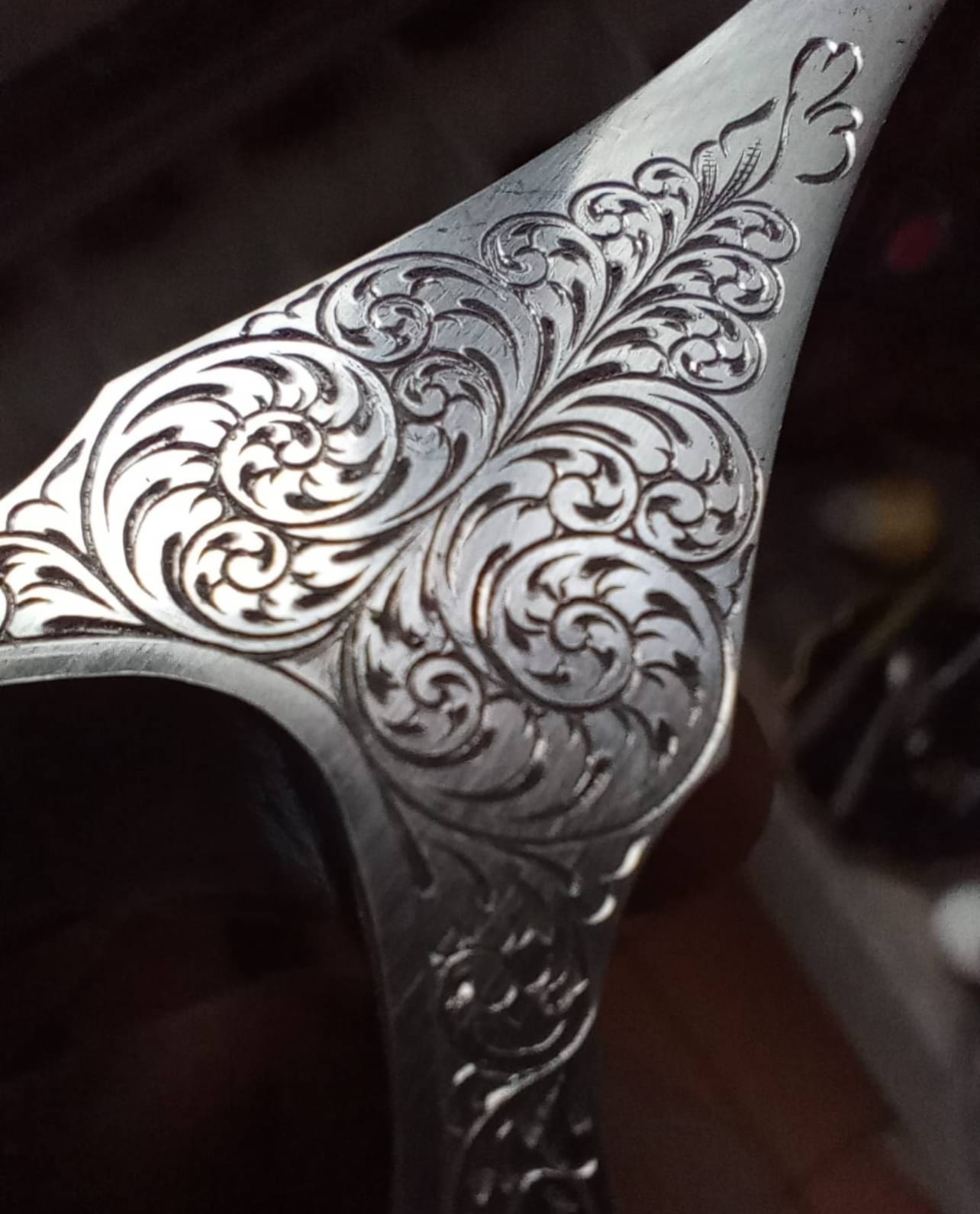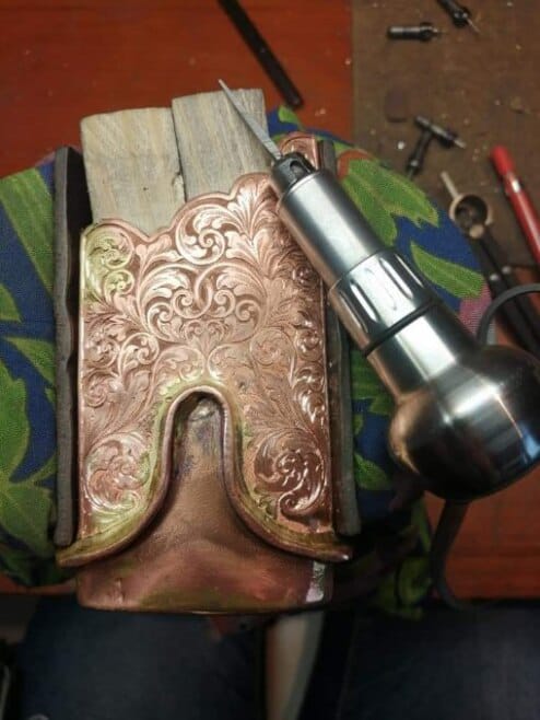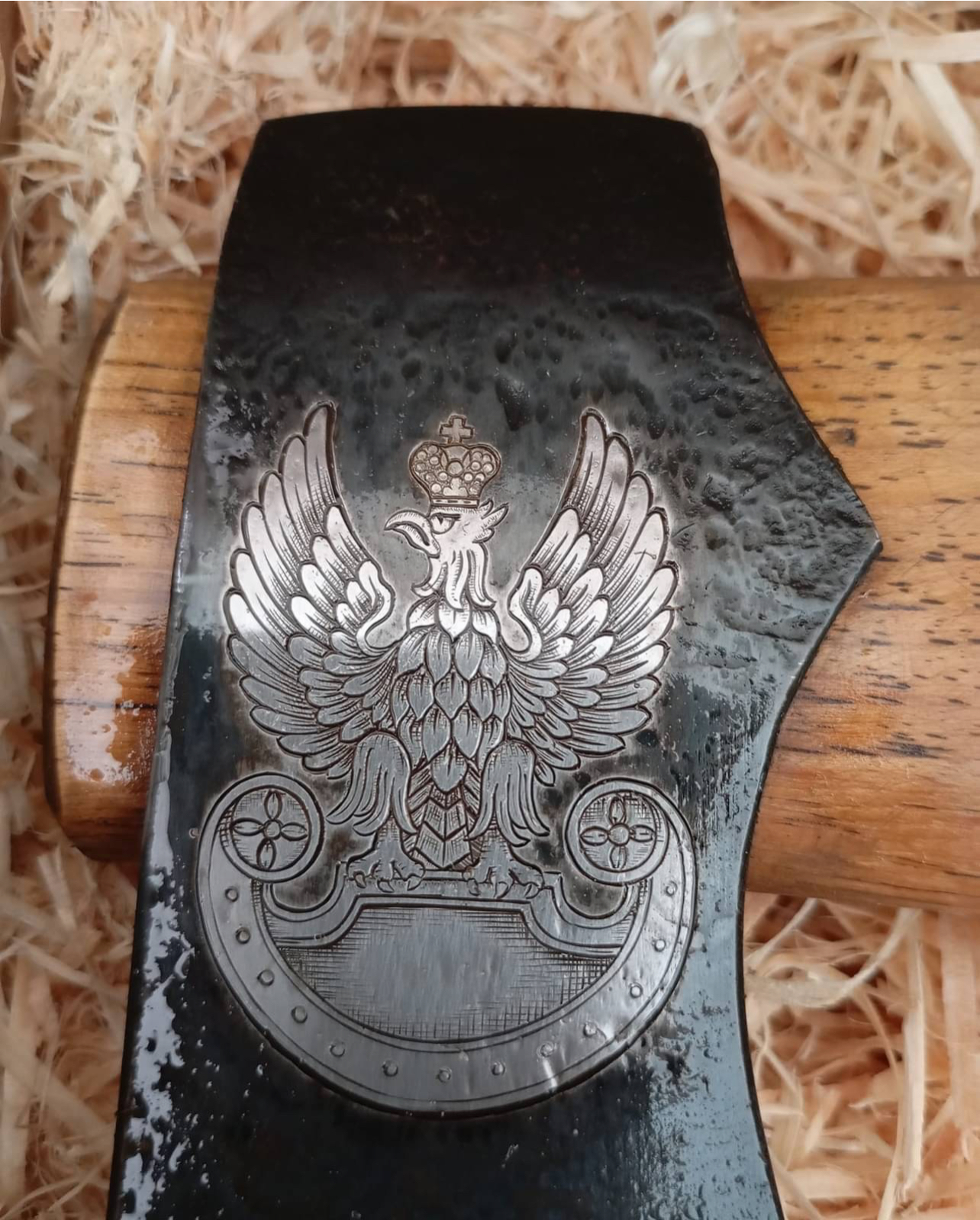 (BM) – Ponieważ zajmuję się grawerowaniem metali więc siłą rzeczy jestem ograniczona do przedmiotów z takich materiałów jak stal, miedź, tytan, brąz, mosiądz, metale szlachetne. Często są to przedmioty kolekcjonerskie, ekskluzywne, kupowane na prezent itp. Zaczęłam współpracę z kowalem, płatnerzem, twórcami noży i tak pojawiła się broń biała – wszelkiego rodzaju szable, toporki i noże. Każdy z tych przedmiotów sam w sobie jest dziełem najwyższej klasy rzemiosła, stworzonym przez najlepszych twórców w swojej branży jacy są w Polsce. W tej chwili tego typu grawerunki stanowią większość moich prac więc jest to w pewnym sensie specjalizacja. W swoim portfolio mam także inne grawerowane przedmIoty jak np. zegarki, medaliony a nawet siodło.